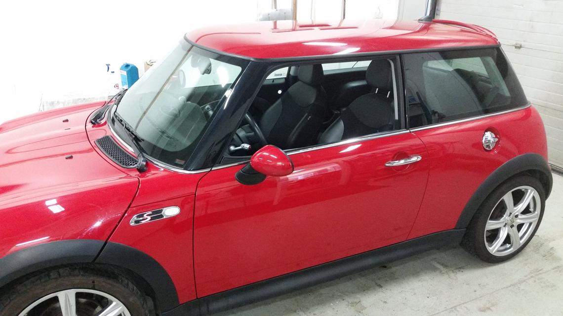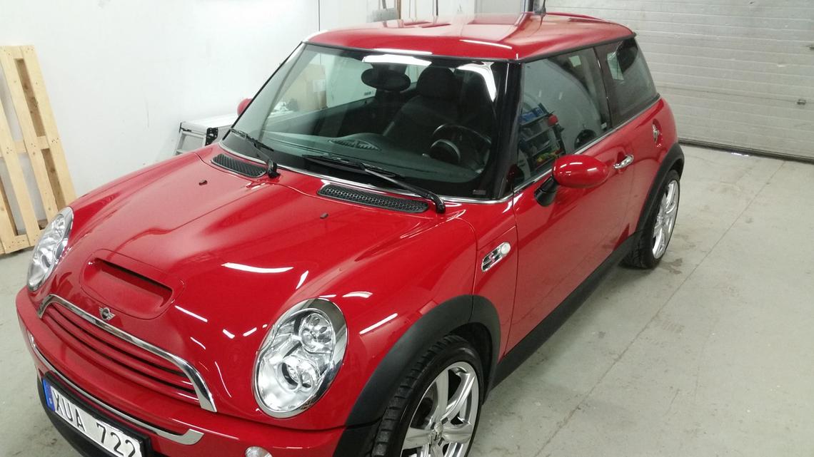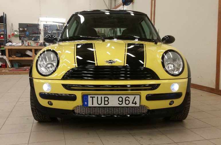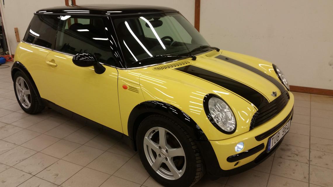 Mini Cooper - Denna bilen har fått en hellackering samt styling, lackerade ränder fram och bak och även alla plastdetaljer är lackerade i svart.